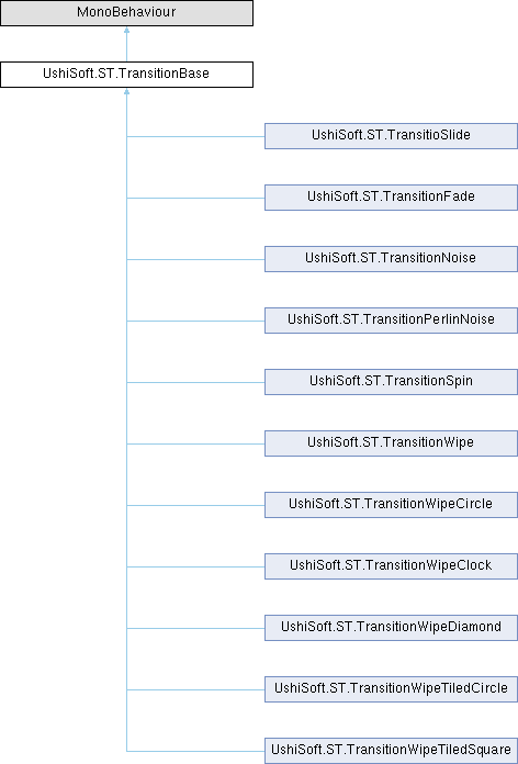 Reimplemented in UshiSoft.ST.TransitionFade, UshiSoft.ST.TransitionNoise, UshiSoft.ST.TransitionPerlinNoise, UshiSoft.ST.TransitionSpin, UshiSoft.ST.TransitionWipe, UshiSoft.ST.TransitionWipeCircle, UshiSoft.ST.TransitionWipeClock, UshiSoft.ST.TransitionWipeDiamond, UshiSoft.ST.TransitionWipeTiledCircle, UshiSoft.ST.TransitionWipeTiledSquare, and UshiSoft.ST.TransitioSlide.